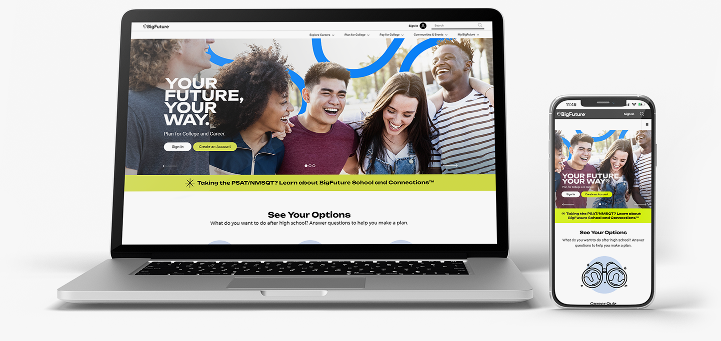 The tagline “Your Future, Your Way” reinforces the idea that BigFuture exists to help its core student audience fulfill their individual potential. It strikes a fine balance between the brand being a much needed guide and advocate, but at the same time, empowering students to use the tools and resources that BigFuture provides to make the best decisions for them.