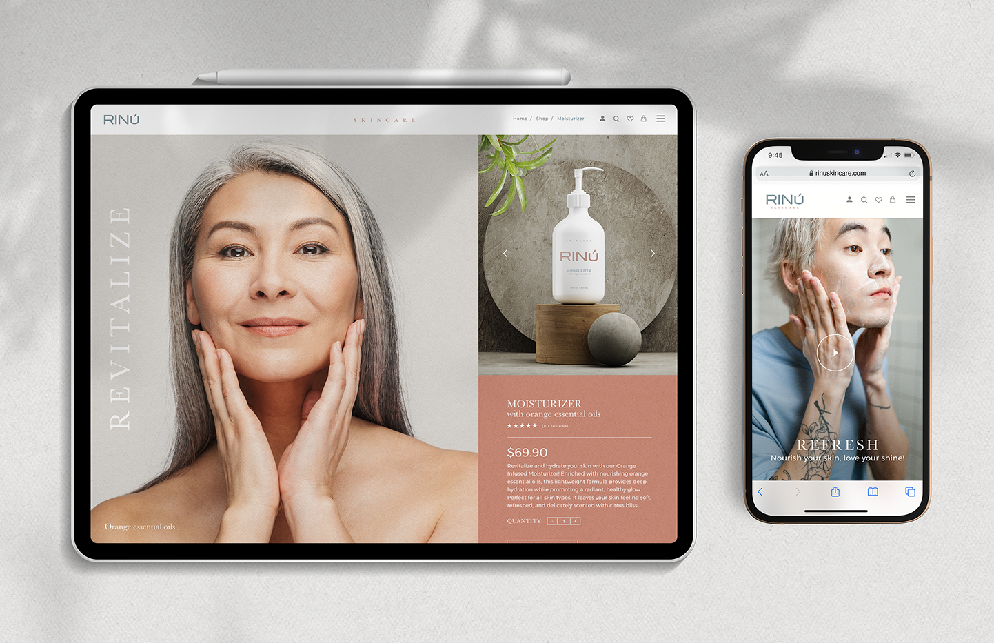 RINÚ (pronounced Renew) i minimal, modern skincare brand designed that radiates calm and confidence. The creative features full visual identity…from logo and packaging to digital presence that reflects RINÚ’s clean formulations and holistic approach to beauty. Soft neutrals, tactile textures, and elevated simplicity illustrate an inviting way to connect with customers.