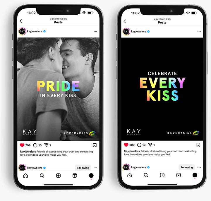 For Pride 2002, KAY Jeweler’s launched the 2nd iteration of their social first campaign encouraging their audience to Celebrate Every Kiss. Not just the love we share within the LGBTQ+ community, but also with our support systems, those who encourage us to live our truths. Together we’re changing our world to be more diverse, accepting and understanding. At KAY, we intend to do it one kiss at a time.