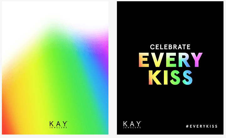 We created an ownable graphic element that will tie together all communication pieces and show our support of the LGBTQ+ community and its allies. The KAY lips will be used with a rainbow color scheme to drive home our celebration of Every Kiss. We'll keep the imagery feeling more organic, offering a mix of influencer/UGC and photography.